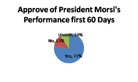 The results of the first Monthly Opinion tracker, conducted by the Egyptian Centre for Opinion Research, Baseera, suggests general satisfaction with Mohamed Morsi's first 60 days in office, with some 77 per cent of Egyptians surveyed approving of the president's overall performance.