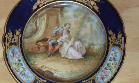 The collection includes crystal chandeliers, porcelain plates decorated with golden frames and foliage drawings, and two blue French ‘Sevres’ vases with flower decorations.